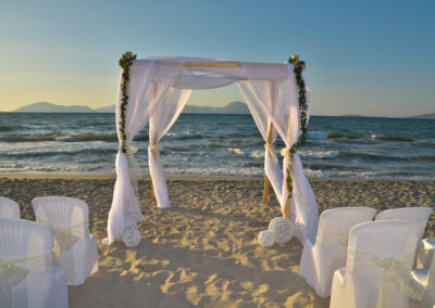 We have a wedding arbour for your beach wedding which is decorated with white organza and fresh flowers to match your colour scheme – much larger and more decorative than an arch.