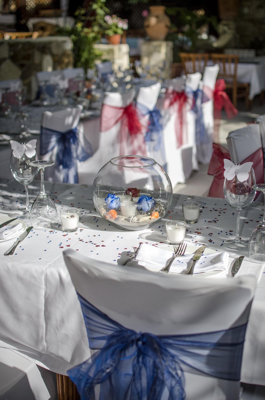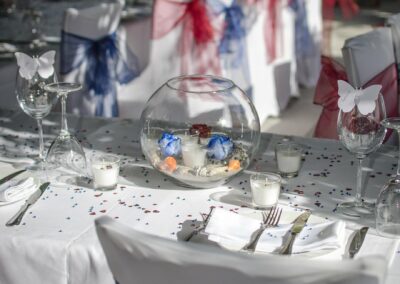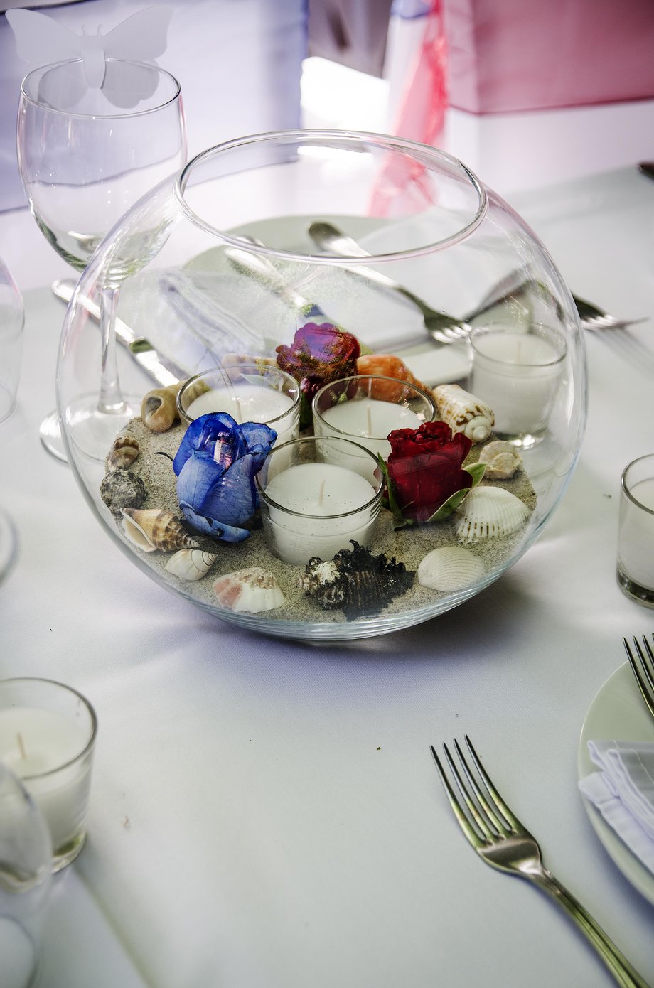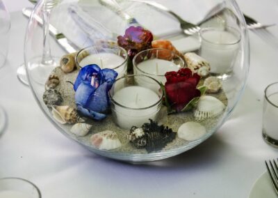 Table centrepieces come in all shapes and sizes. With a lot of our weddings taking place on the beach, the main theme is with sea shells and candles but you might want something different and we can do this for you; each Bride is individual and we like to make your decorations unique.